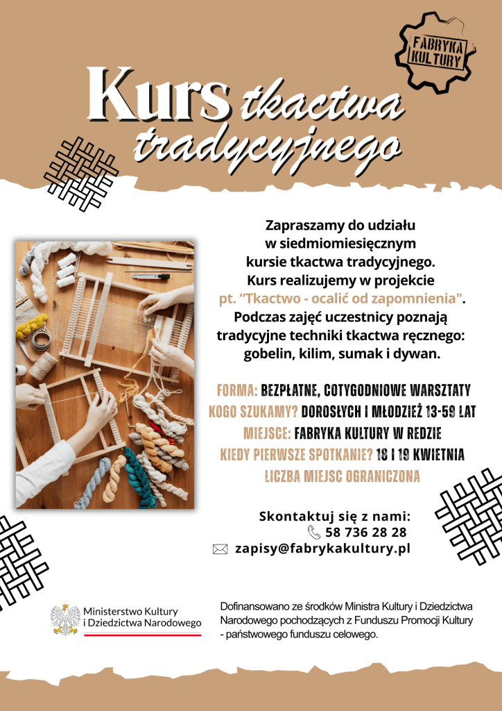 Zapraszamy do udziału w wyjątkowym, siedmiomiesięcznym kursie tkactwa tradycyjnego prowadzonym przez mistrza tradycji. Celem projektu pt. „Tkactwo – ocalić od zapomnienia” jest przekazanie ginących umiejętności zgodnie z lokalnym dziedzictwem kulturowym.