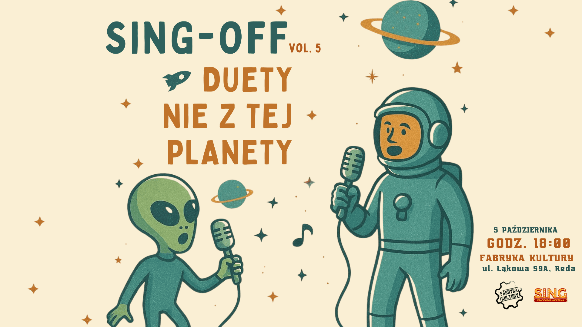 🚀 Gotowi na międzyplanetarną i międzymiastową podróż pełną muzyki? Tym razem uczniowie SING Pracowni Wokalnej zabiorą Was w kosmiczną podróż aby odkryć nową scenę muzyczną, czyli Fabrykę Kultury w Redzie. Będzie to nasz pierwszy koncert organizowany w tym miejscu, więc nie może Was zabraknąć w ten wyjątkowy wieczór.