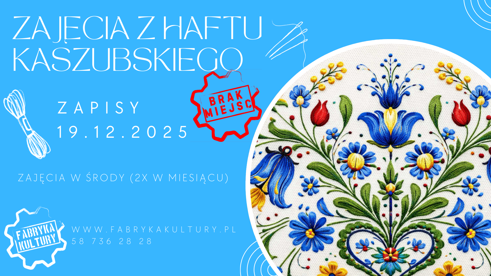INSTUKTOR ZAJĘĆ: BARBARA JAEDTKA-WALASZKOWSKA – 2015 ukończyła kurs haftu prowadzony przez Twórczynię Ludową W. Mironkiewicz, od 2015 r do 2021r uczestniczyła w powiatowo-miejskim konkursie haftu w Wejherowie, zajmując pierwsze miejsca, od 2015 r. członki hafciarskiego Klubu Tulpa przy ZKP o/ Wejherowo, a od 2020 r prezes tego klubu, od 2016 r uczestniczyła w Ogólnopolskim Konkursie Haftu w Linii, zajmując wysokie noty, 2019r prowadząca warsztaty haftu w Ciekocinie podczas Festiwalu Dworów, 2019r otrzymała tytuł Twórcy Ludowego i od tej pory należy do Stowarzyszenia Twórców Ludowych o/ Gdańsk, 2017r uczestniczka w Jarmarku Dominikańskim, od 2021 r prowadzi kursy haftu, organizowane przez Zrzeszenie Kaszubsko-Pomorskie w siedzibie ZKP o/ Wejherowo, 2021r prowadziła ministerialny kurs haftu pod nazwą Mistrz Tradycji w Filharmonii w Wejherowie, 2025r marzec – przeprowadzenie warsztatów z haftu podczas głównych obchodów Dnia Jedności Kaszubów w Gminie Wejherowo, 2025 r warsztaty w Muzeum Piśmiennictwa i Muzyki Kaszubsko-Pomorskiej, 2025 r prowadzenie warsztatów haftu w ramach projektu „Haft czepcowy (od) nowa -powrót do tradycji z programu Folk (od) nowa oraz liczne mniejsze warsztaty, choćby w Skansenie w Małrzycach koło Łowicza.