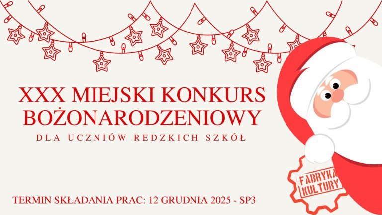 Fabryka Kultury wraz ze Szkołą Podstawową nr 3 w Redzie zapraszają uczniów redzkich szkół do udziału w XXX Miejskim Konkursie Bożonarodzeniowym! SKŁADANIE PRAC:termin: 12 grudnia 2025, godz. 15:00miejsce: Szkoła Podstawowa…