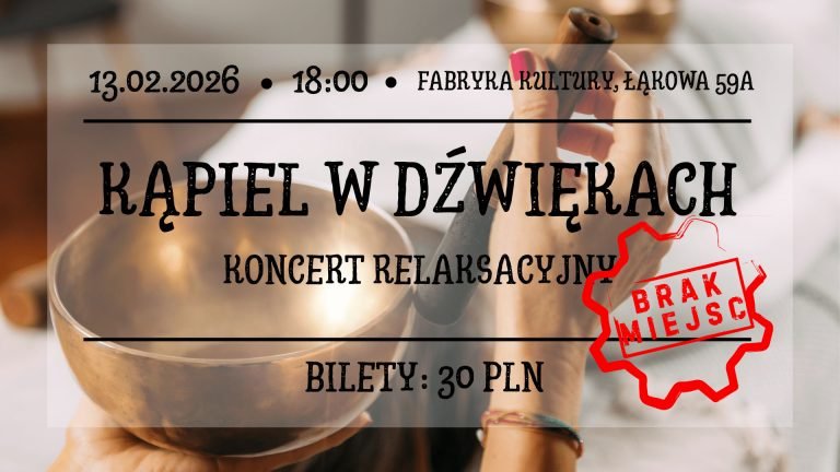 13 LUTEGO 2026 | 18:00-19:30 | BILETY: 30 PLN | FABRYKA KULTURY KĄPIEL W DŹWIĘKACH – koncert relaksacyjnyZapraszamy na koncert gongów, mis, dzwonków oraz innych instrumentów archaicznych, który relaksuje, łagodzi…