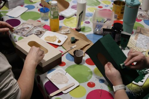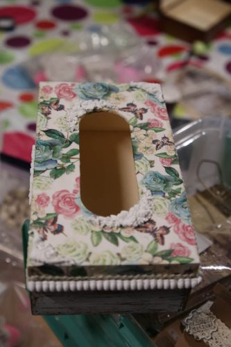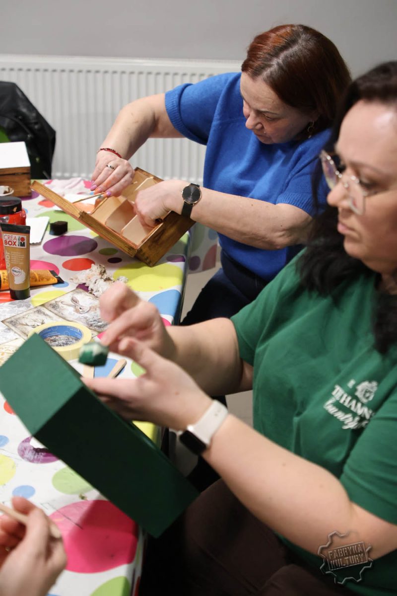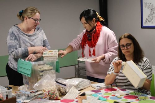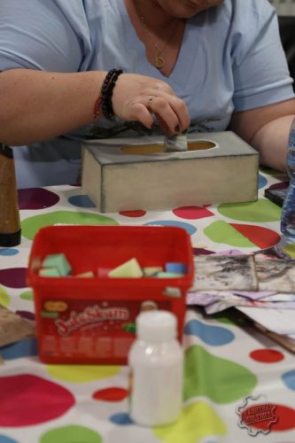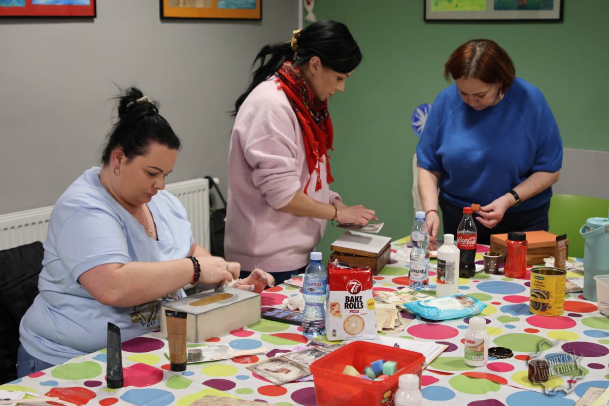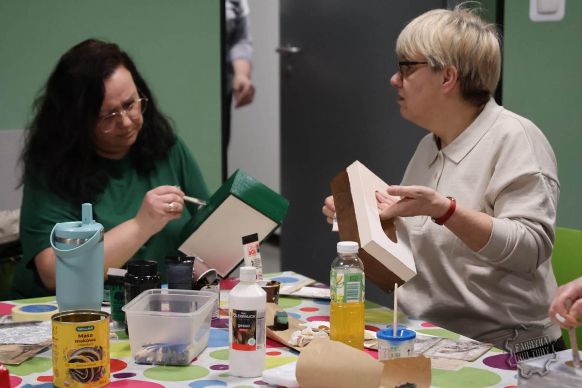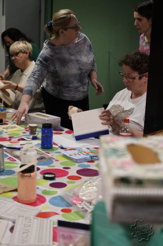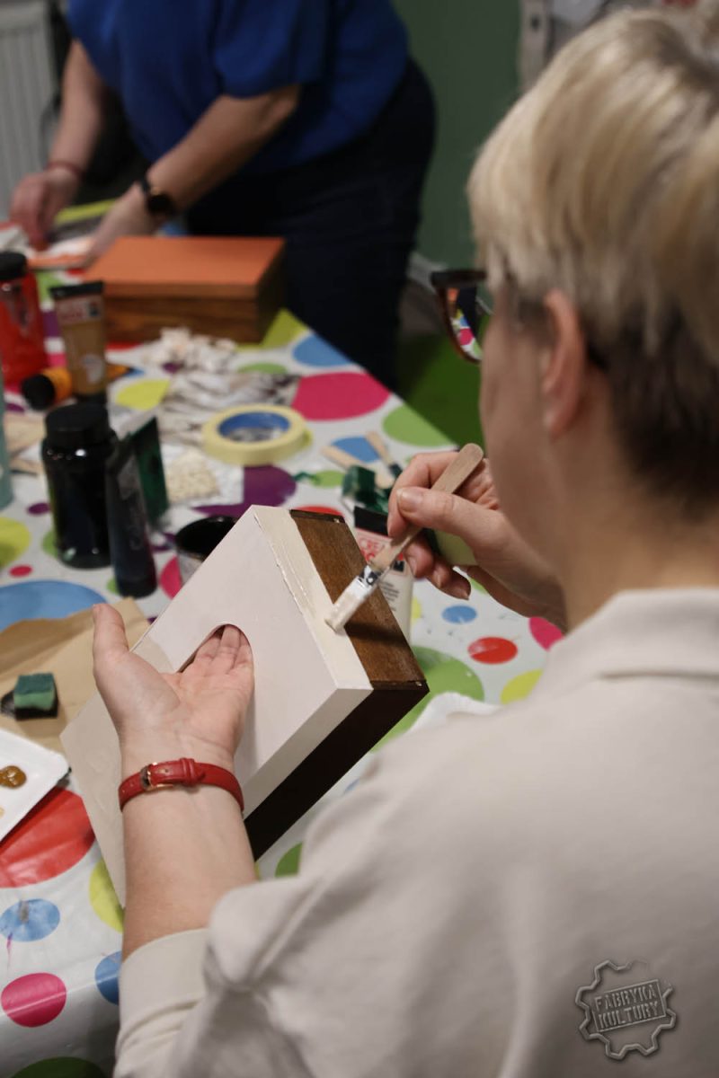 Dobiegł końca cykl trzech spotkań warsztatowych, w trakcie których Panie samodzielnie dekorowały herbaciarki, skrzyneczki i chusteczniki. Pod okiem prowadzącej Surf_pętelka poznały technikę decoupage oraz sposoby wykorzystania gliny samoutwardzalnej do tworzenia ozdób. Powstały wyjątkowe, praktyczne i estetyczne prace, które mogą pełnić funkcję dekoracji lub oryginalnego prezentu.